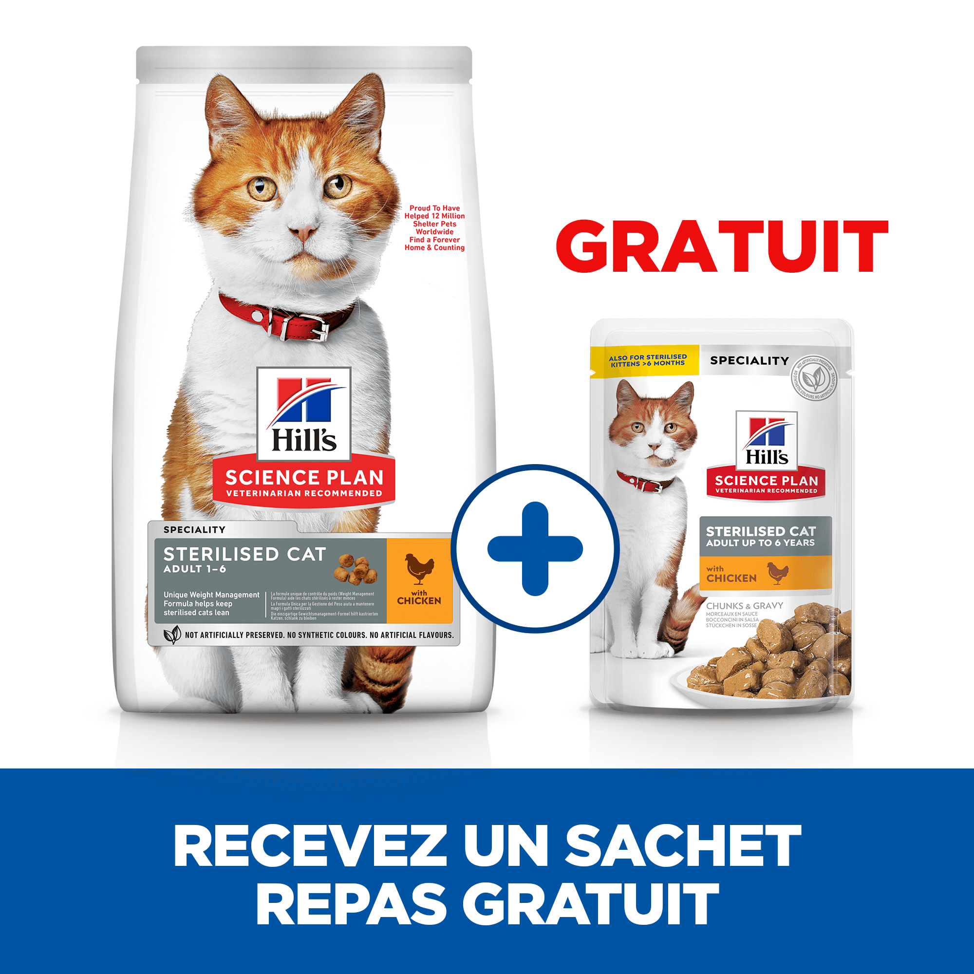 Hill's Science Plan Sterilised convient aux chats stérilisés ou castrés, jusqu’à l’âge de 6 ans. Utilisez ensuite Hill's Science Plan Mature Adult Sterilised.